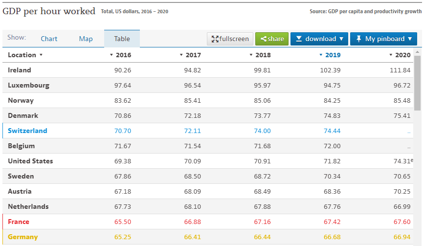 Of course, these stats will be heavily skewed by the exports of natural resources, or whatever is going on in Ireland (some accounting tricks for sure). But it’s weird to see that France is actually more time-efficient than Germany, or is only 12 years behind Switzerland.