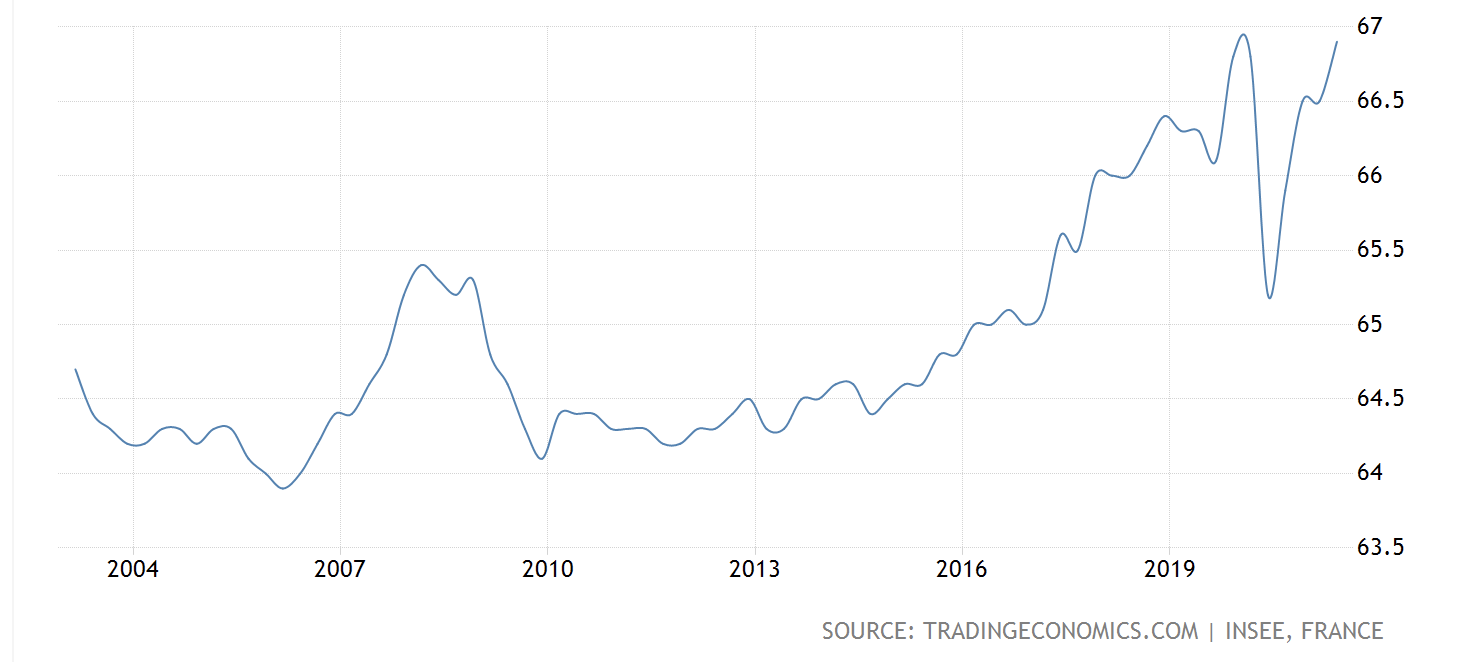 We’ve discussed unemployment metrics in the past, and I think the consensus was that unemployment rate can be misleading, depending on how it’s counted. Here’s the employment rate, which shows how many people are working (at least 1 hour per week), relative to the whole population in working age (in Switzerland it’s 80%)