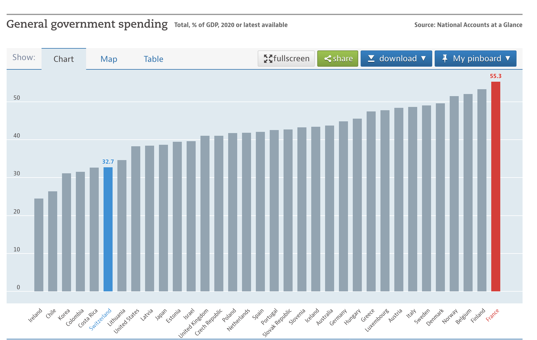 For the gvt. spending you have to take in account the private/public health care systems. Both France and Switzerland are around 10% or GDP, but I doubt it is counted in the Swiss graph as the gvt. do not pay much of it…