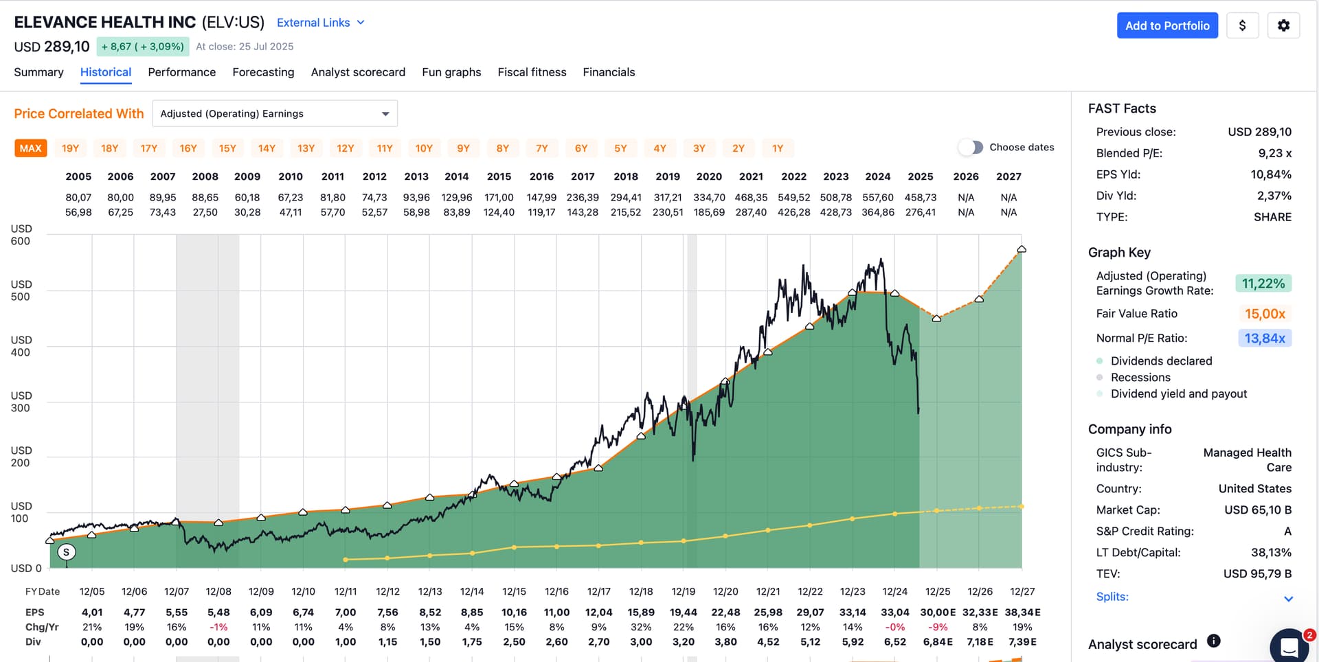 Elevance does not look expensive now, that is true. But it seems to be on the way down. I usually wait until it starts rising. It is kind of a tightrope walk; I want it to have momentum, but I still want it to be kind of cheap.