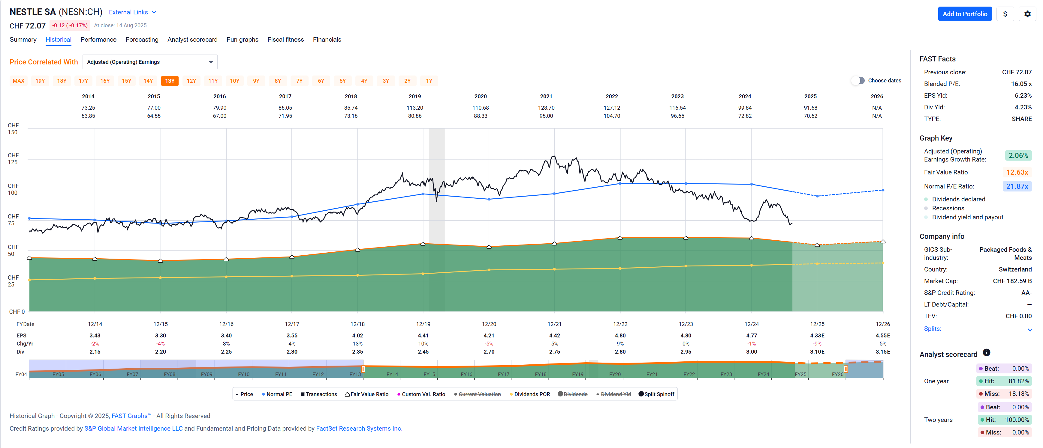 NESN: Still overvalued (IMO), and not enough growth. Too bad they trade in CHF, maybe?
