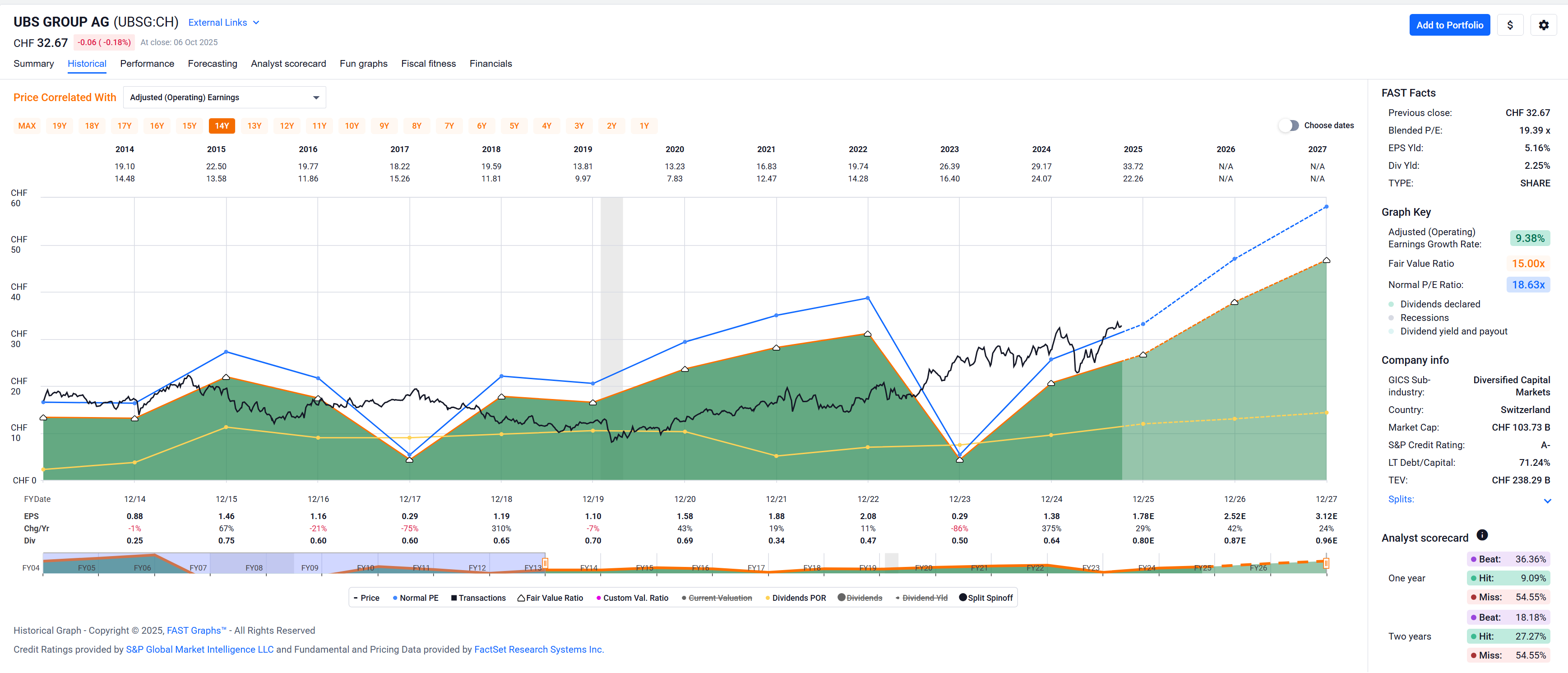 UBSG: Slightly overvalued, but the earnings trajectory looks fine (since the GFC).[§, §§]
