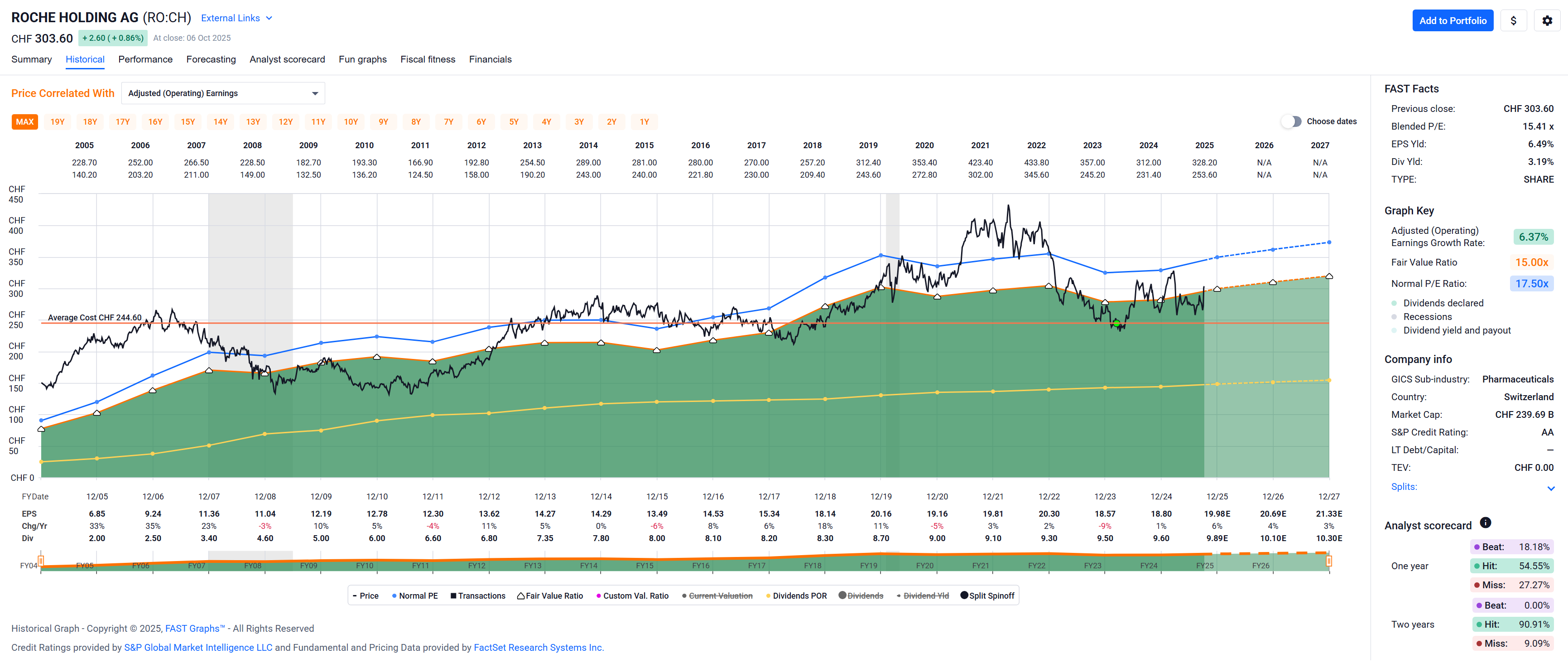 GEBN: Somewhat only moderately fast growing business (maybe like RO above). Currently quite overvalued even against the valuation the market has historically attributed (a 23xP/E, the blue line).