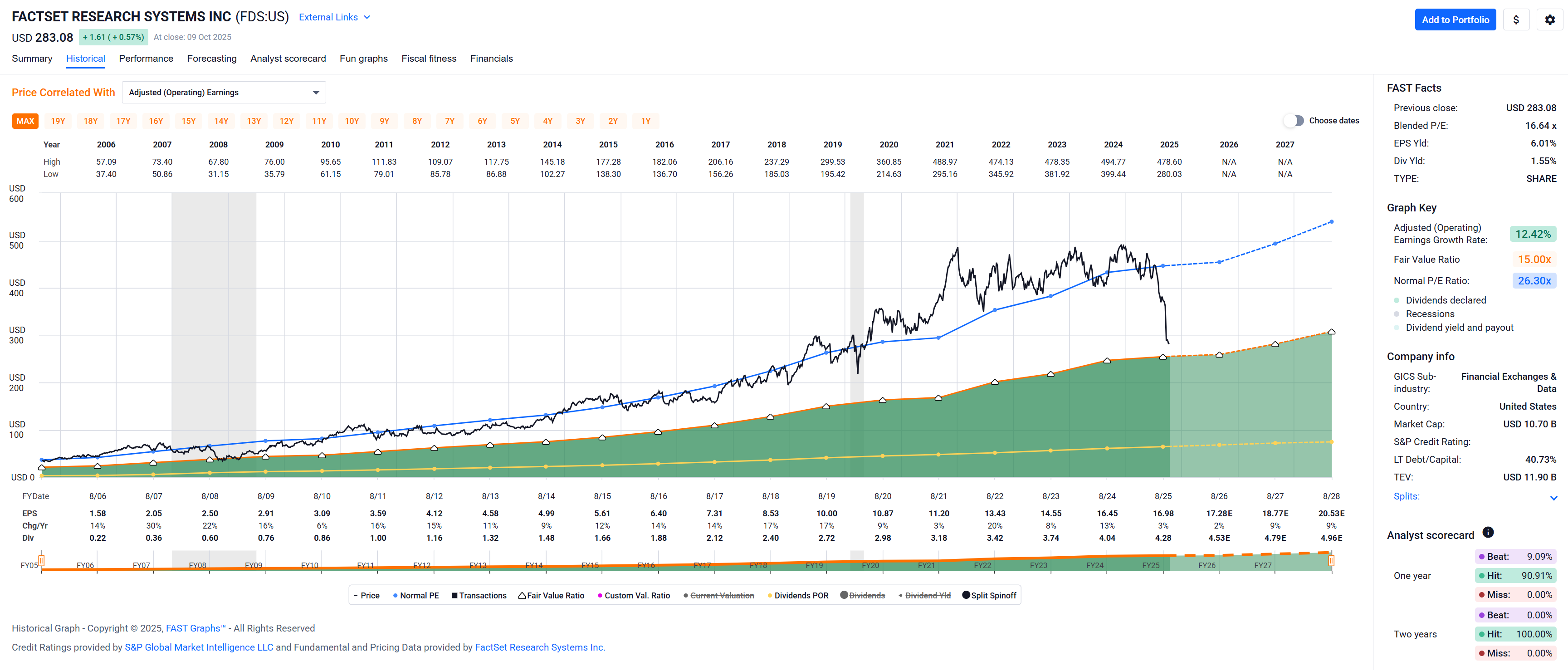 How do folks like FactSet? It powers the data behind FASTgraphs (and probably every quantative financial instituiton with more than two equity portfolio managers) and came down recently because of an earnings miss and (probably?) some AI fear.