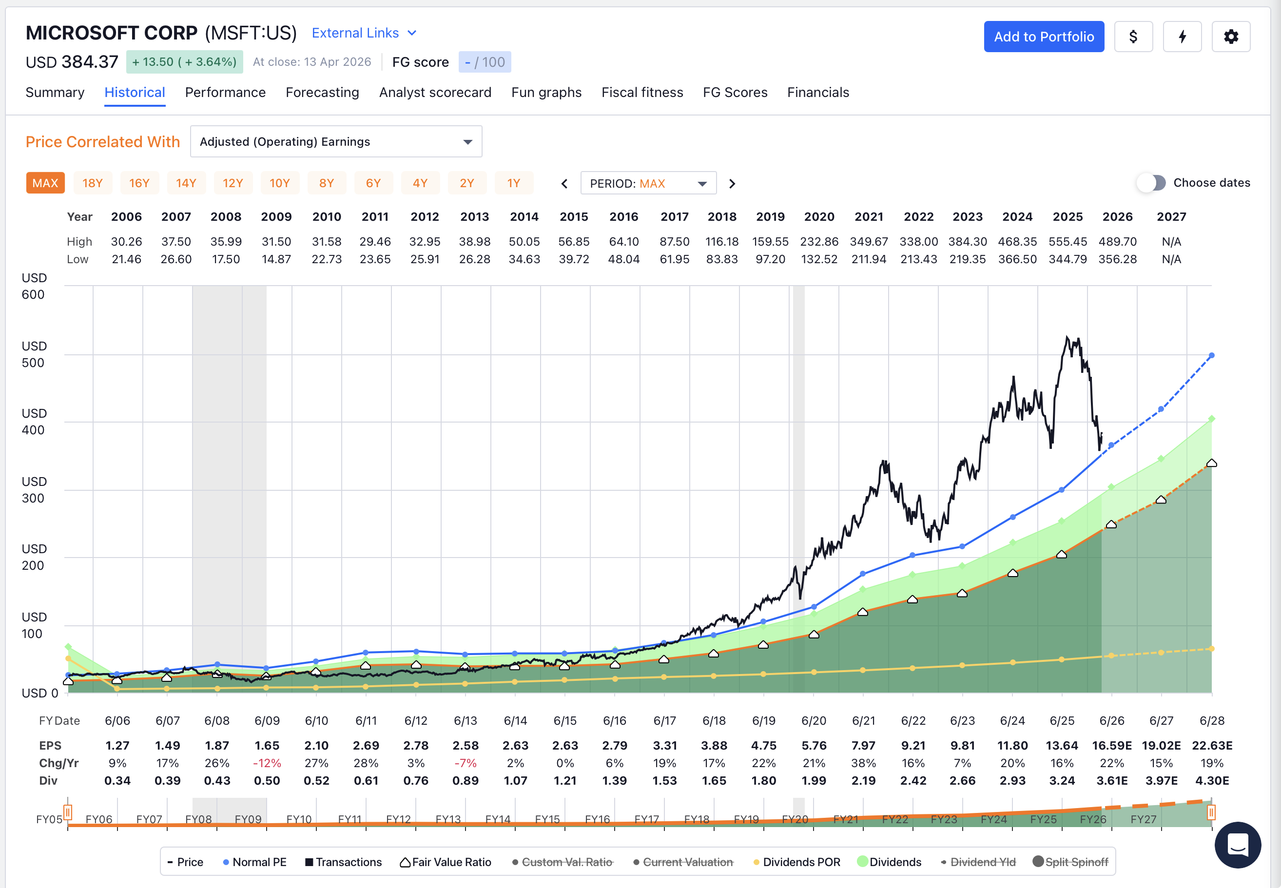 Microsoft… dropped substantially from recent highs. Could be interesting to enter (or just wrote an out of the money Put). What does the nice graph say about Microsoft?