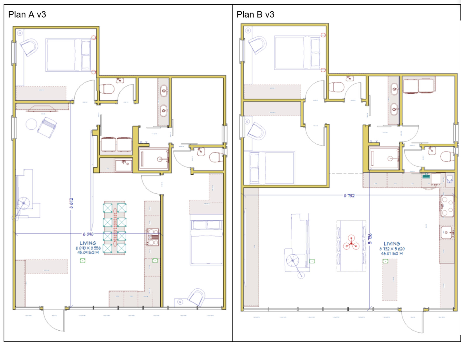 Hey folks, I made some additional tweaks to Plan A and realized both layouts have the same 45 sqm living space. Plus, Plan A’s west-facing window offers a tiny lake view from the kitchen island, while Plan B’s south-facing windows show a small concrete area with a street in front.