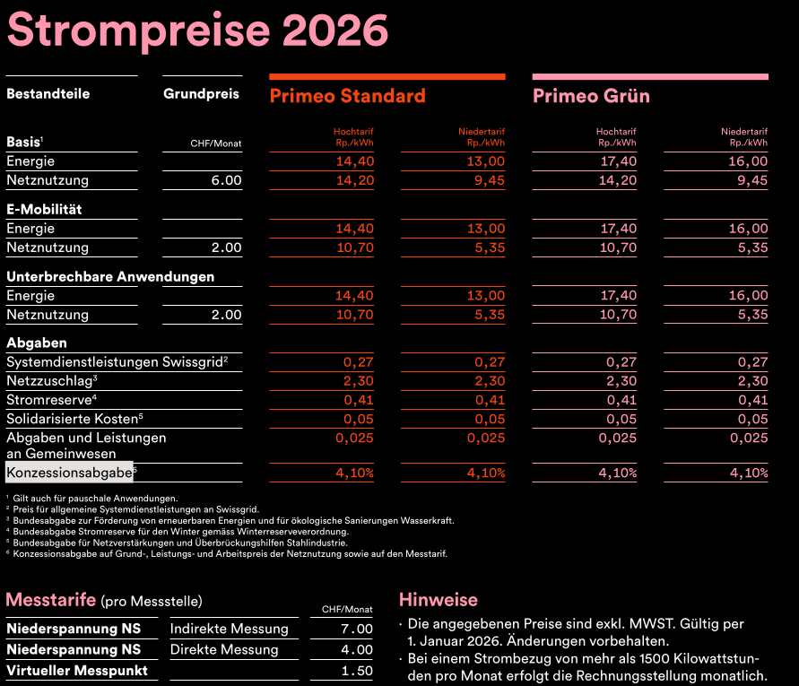 It’s a bit intransparent, since they charge a flat 6 Fr per month in addition to the unit price so you have to divide that by the total consumption and add it on. Also prices they quote don’t include VAT.