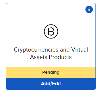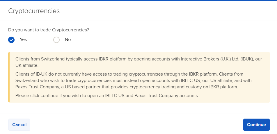 - There will be a pop up box on the screen asking for the trading permissions in Crypto currency > Select to trade in Cryptocurrency for your account to open under IBLLC-US entity.