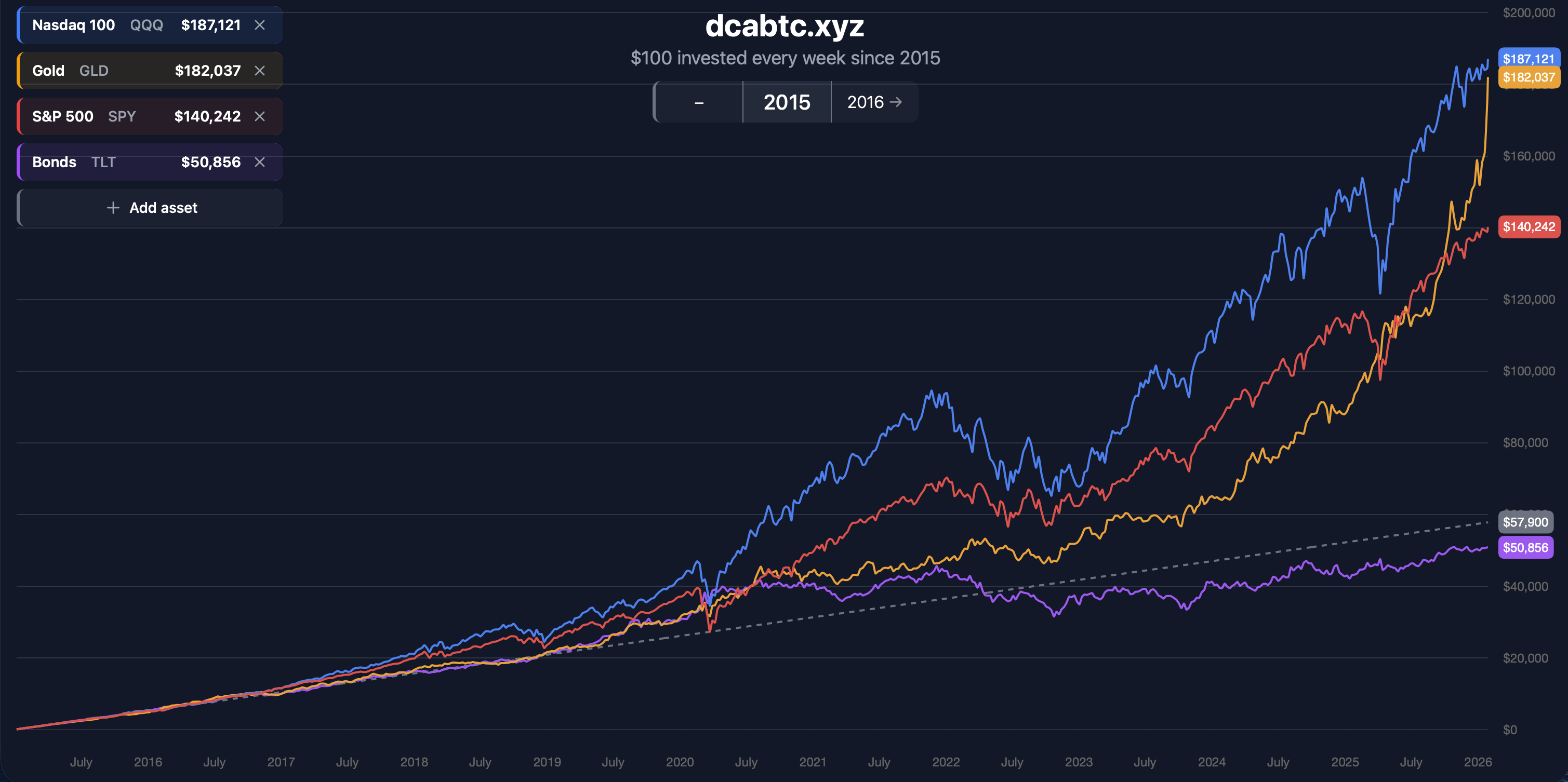 Hereâs a chart showing the last 10 years with equal monthly investments.