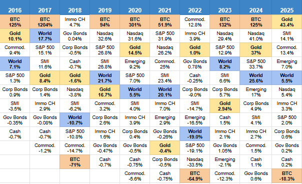 Here’s the asset class quilt for 2025 in CHF. Amazing returns of gold and in hindsight, local bias SMI would have been beneficial. Still, our anchor World ETF delivered above 3.5% (“safe” withdrawal rate). Bitcoin was a substantial loser.