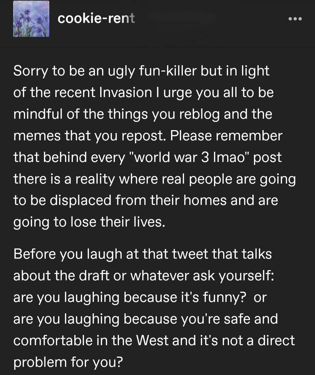 Just watch a few videos. A civilian block of flats in Kharkiv with no windows, a traffic jam on the highway with sirens blaring, a live footage of a missle hitting the airport in Ivano-Frankivsk. This is terrifying. But yeah, youâll be fine in your cozy bed, your stocks will be fineâŠ