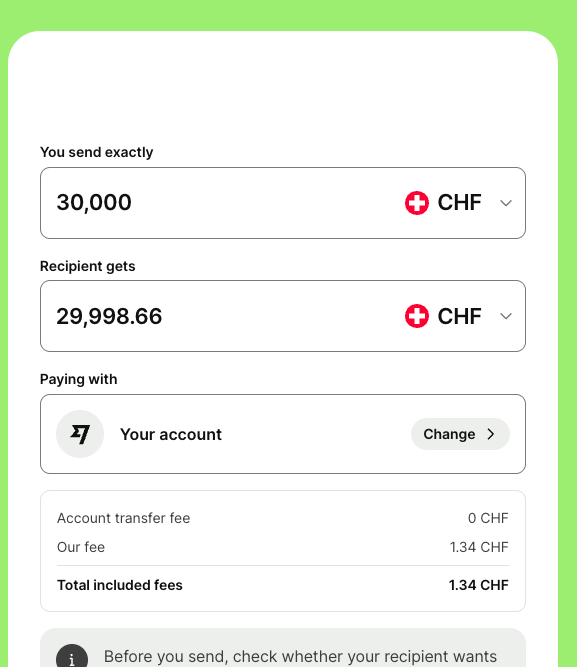 I checked ibani too. It says 0.4% fee when I check now but the total CHF output given I estimate a spread on the rate of about 0.05-0.1%, so it’s not really good either but still slightly better than Revolut Premium for these amounts.