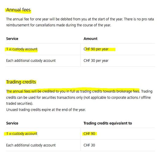 At Swissquote I am currently at 16.61 CHF / Quarter. Total 66.44 CHF/Year. I was considering Cornertrade to avoid the Swissquote fee but now if I trade once a year I will be worst off… need to think…