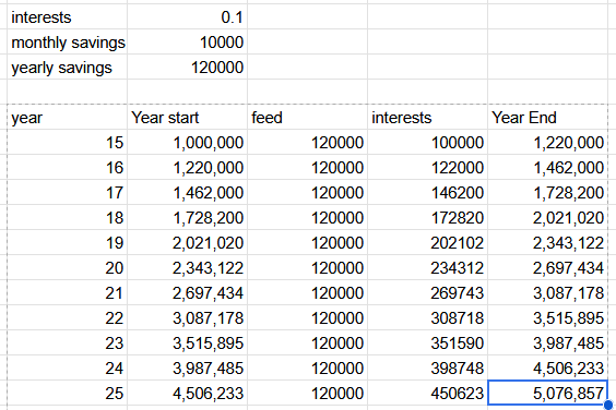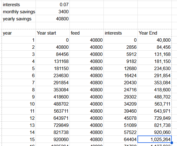 the “7-figures” after (25-10=) 15 years i think is quite realistic for typical frugal people with decent income to achieve. assuming yearly interest of 7%, monthly savings of 3400 already get you there