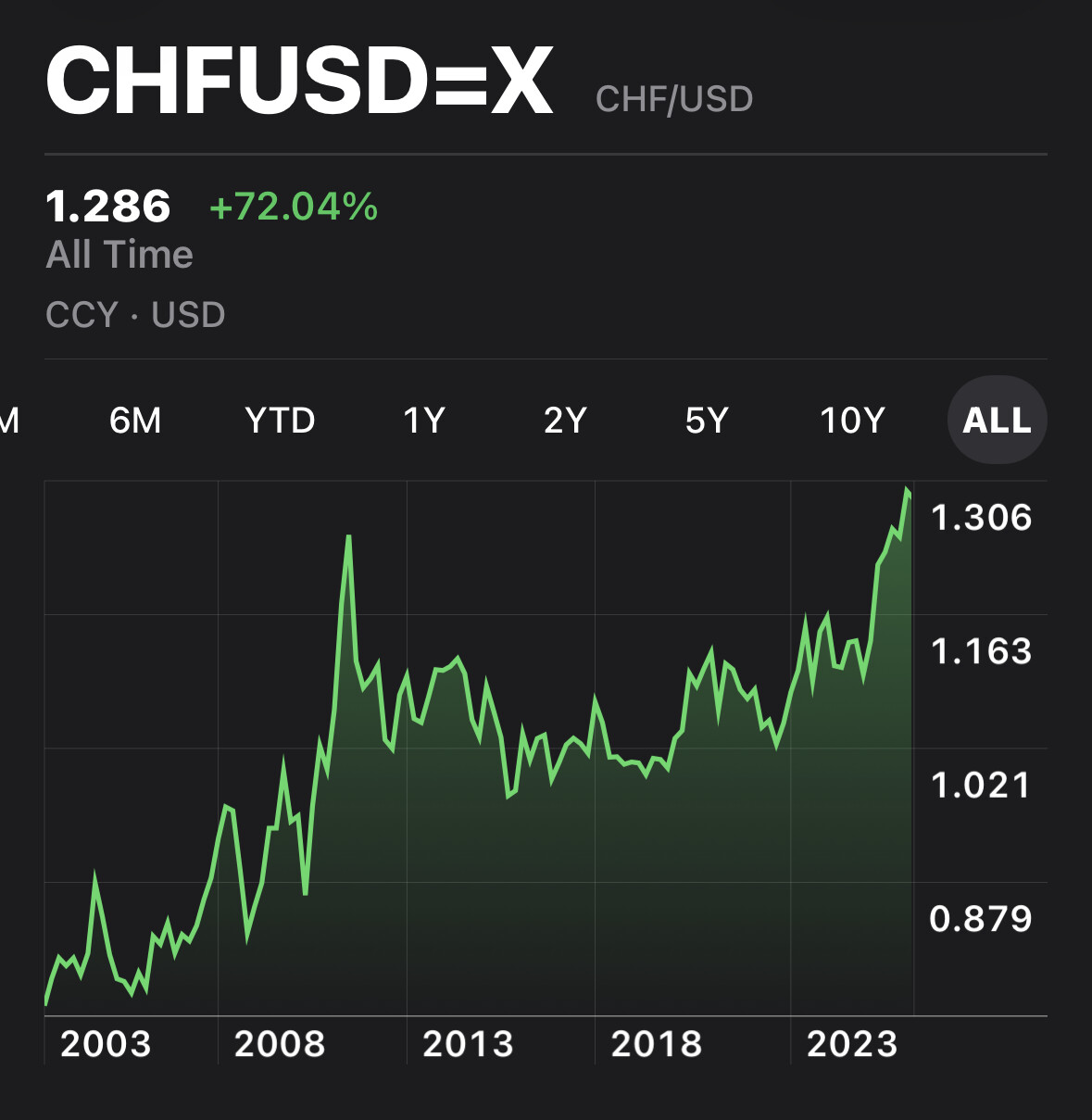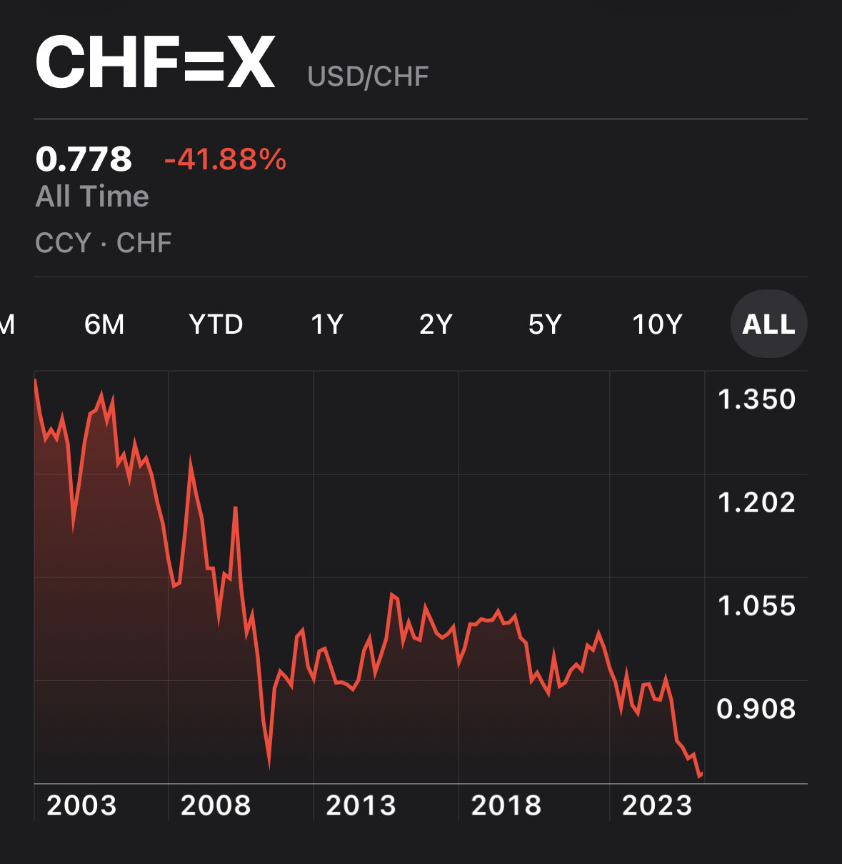 Or, buying chf with your usd is basically betting this trend goes on: