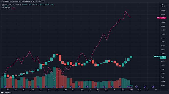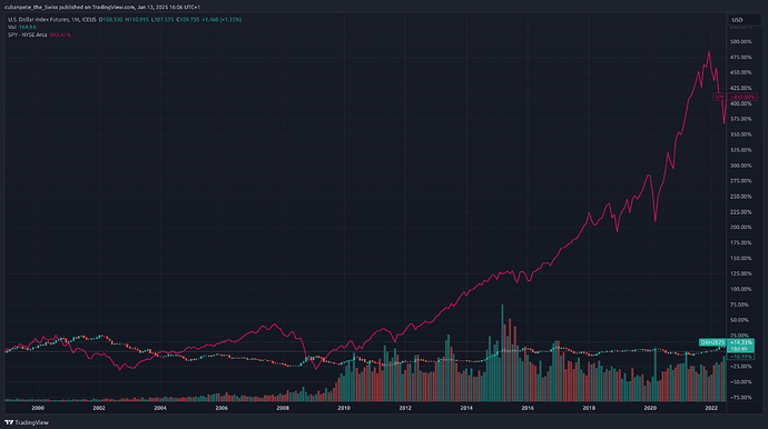 I think you find statistics for everything. Letâs compare the dollar index to the SP500 (with dividends, SPY ETF) in different timeframes:
