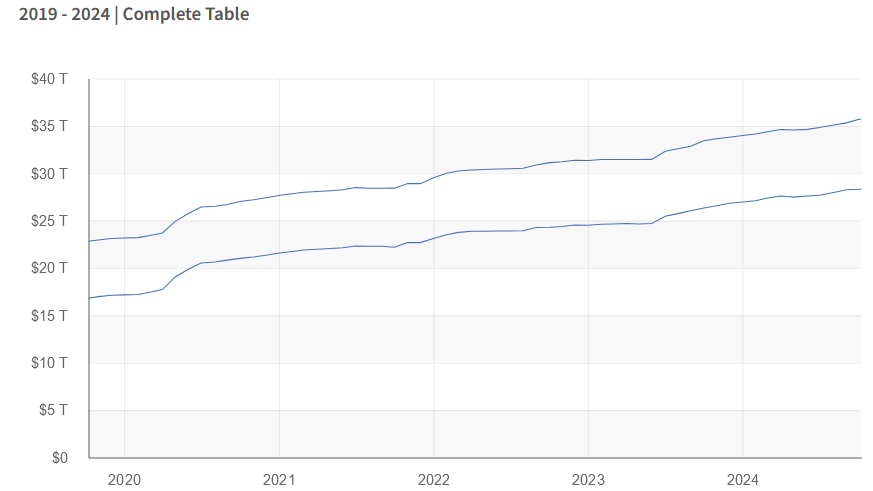 Total public US debt (higher curve, currently around 35T) and debt held by the public (lower curve, currently around 28T):