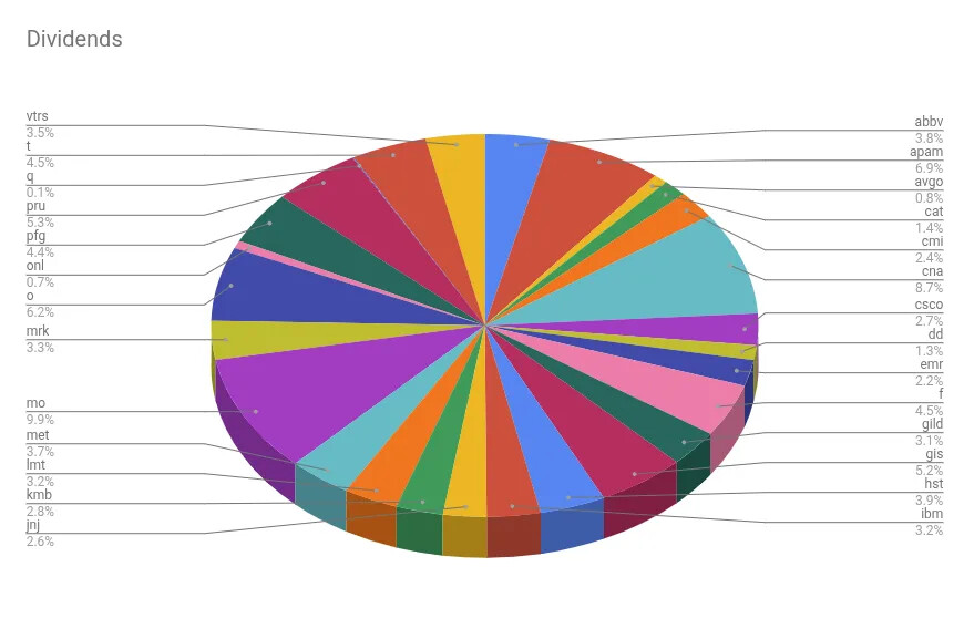 Dividends: F,CNA,CMI,JNJ,MET,EMR,IBM,PRU,DD,Q,O,VTRS,PFG,GILD,LMT, AVGO.