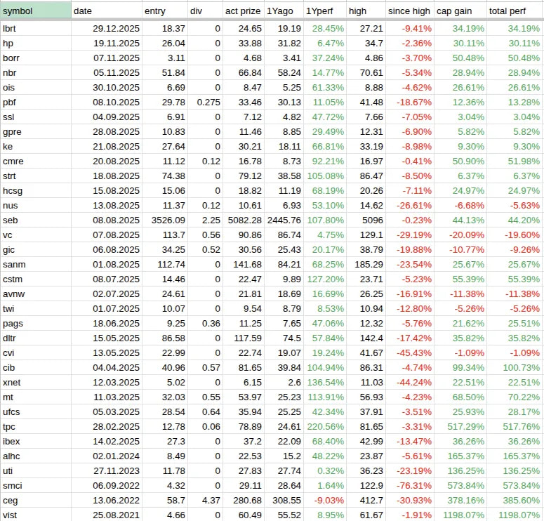 The last 6 buys were oil and gas, all are double digits in the green. Nice.
