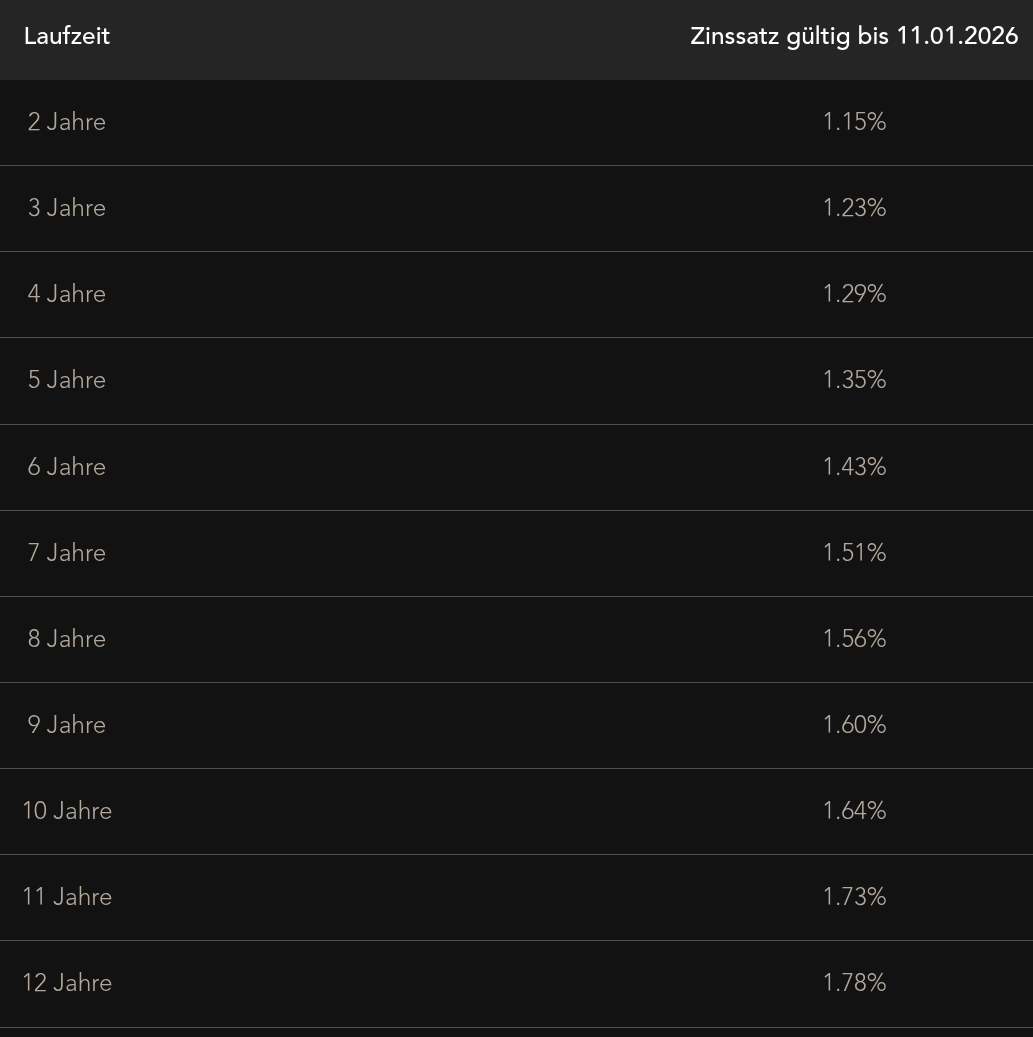 At least Migros gives you the conditions straight on their website, and theyâre competitive to the best of my knowledge. If it was only up to me, I would have gone with them a long time ago, but we decided with the other couple (weâre building 2 semi-detached houses together) to use the same bank for the construction credit to make things easier. And they want to analyse the whole competition, but itâs not moving. (Sorry for the rant.)