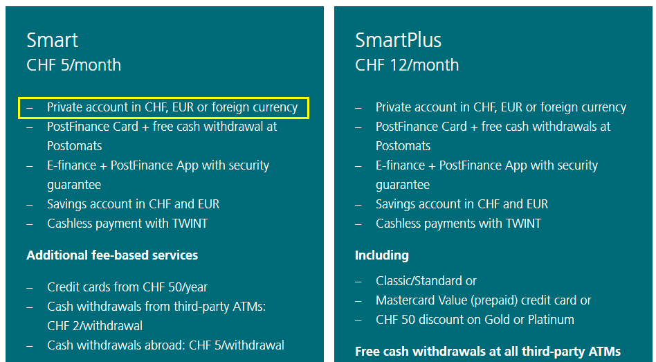 As a side note: As far as I have seen the new Postfinance banking offers do include accounts in only one single currency. It seems that it’s not possible to have multiple accounts in different currencies with the new banking package as it is the case with the old one (at the moment I have accounts with CHF, EUR and USD all included with my package). That’s one more disadvantage!