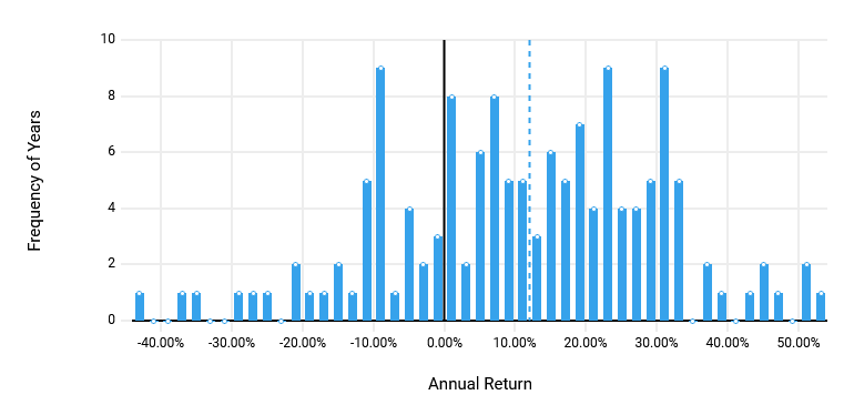 This is a histogram of annual returns for tesfolio’s SPYSIM (large cap US stocks, back to 1885).