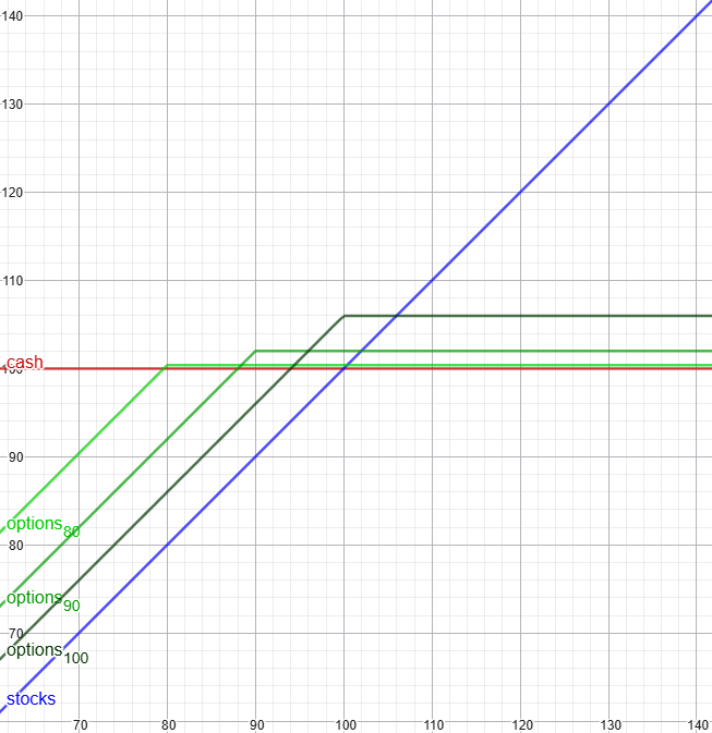 This compares the 3 strategies (staying in cash, buying stocks, cash secured puts). The underlying stocks are worth 100. Volatility was assumed at 15%, maturity for options is 365 days out. To focus on the relevant part, dividends and interest where set to 0. This gives around 6 premium for a strike at 100, 2 for a strike at 90, and 0.4 for a strike at 80 (option-price.com).