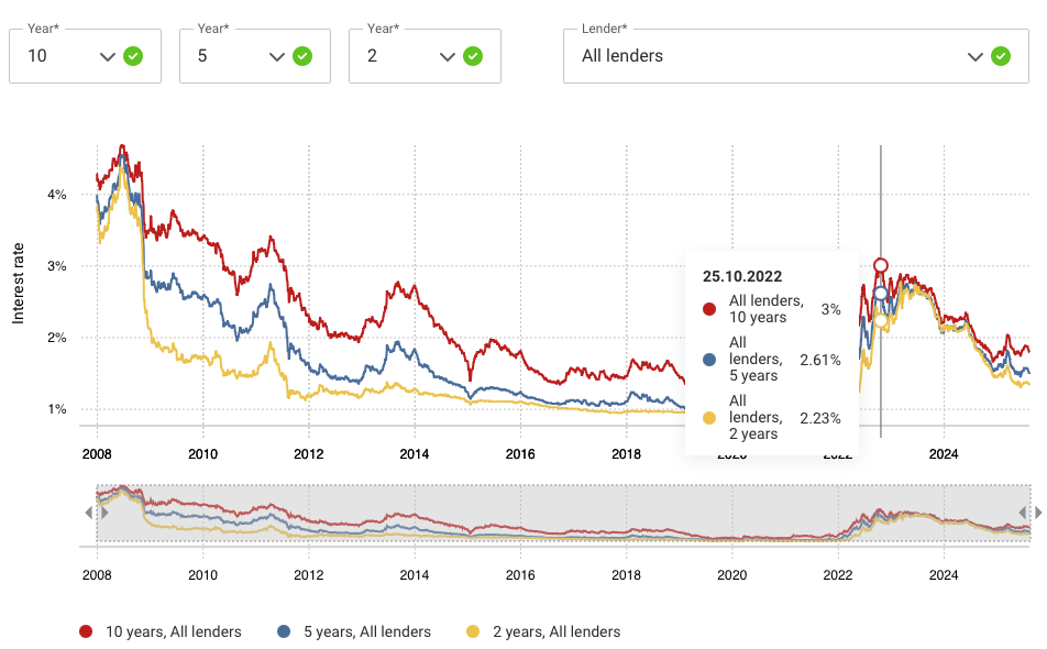 First, how likely is it that all people who have to renew at the local peak in 2022 (where - according to comparis - 10Y fix was at 3% - and one could also choose a shorter duration, e.g. 2Y at 2.23%) will fail to meet the affordability criteria?