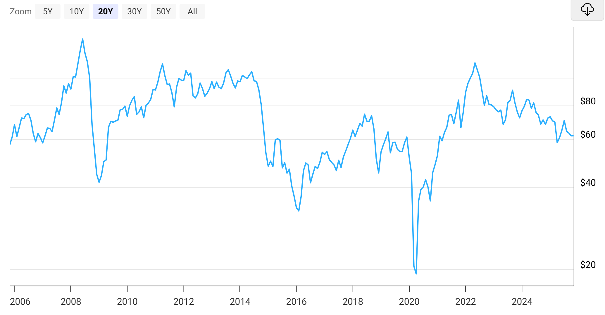 OK, crude oil in USD is another story. Never made it back to the June 2008 peak ($147 per barrel).