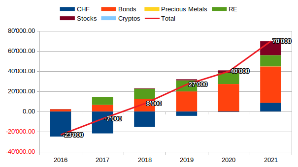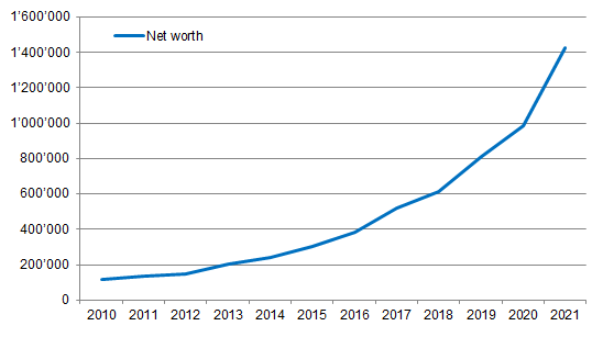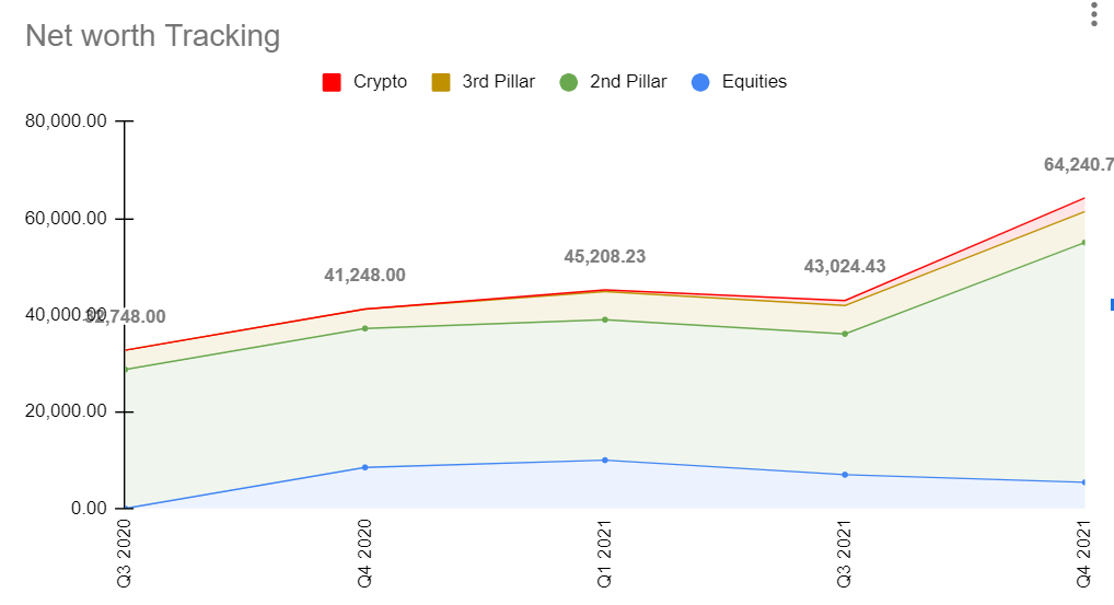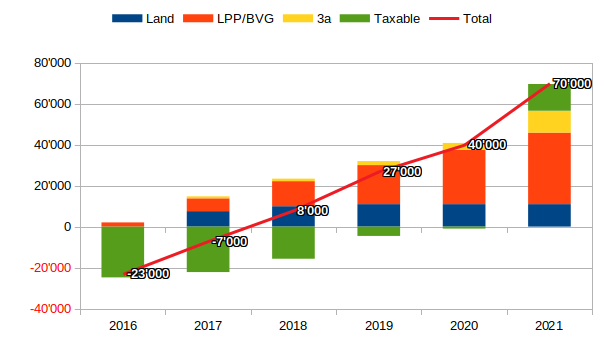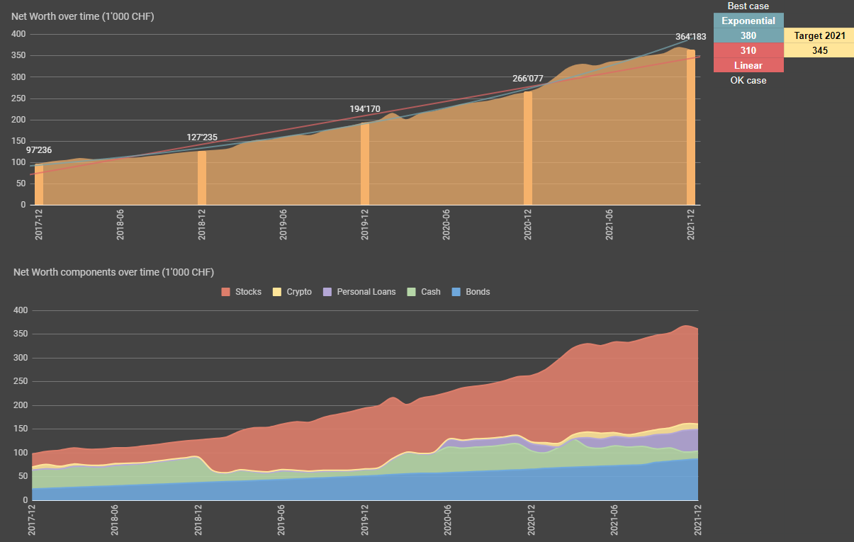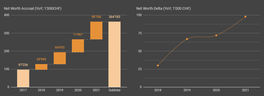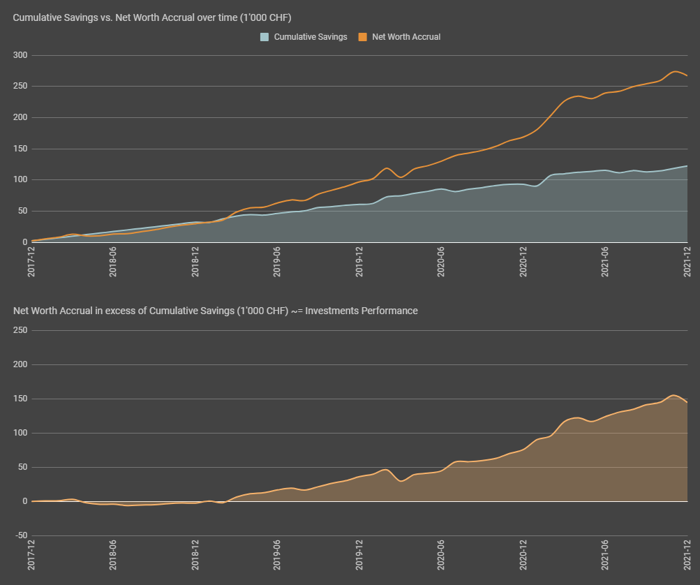 Over 400k CHF increase sounds (and is!) astonishing, but despite the previous comment it’s to a large degree merely a consequence of a growing equity-heavy investment portfolio with nice market returns (really felt the compounding effect this year) and a very decent savings rate.