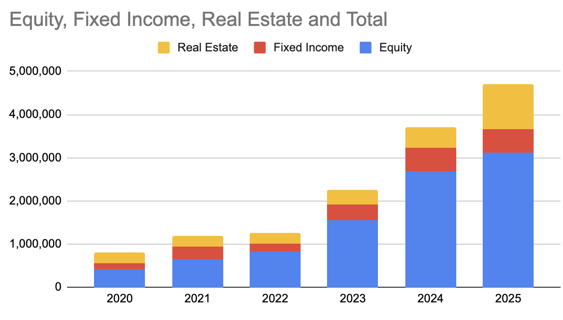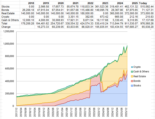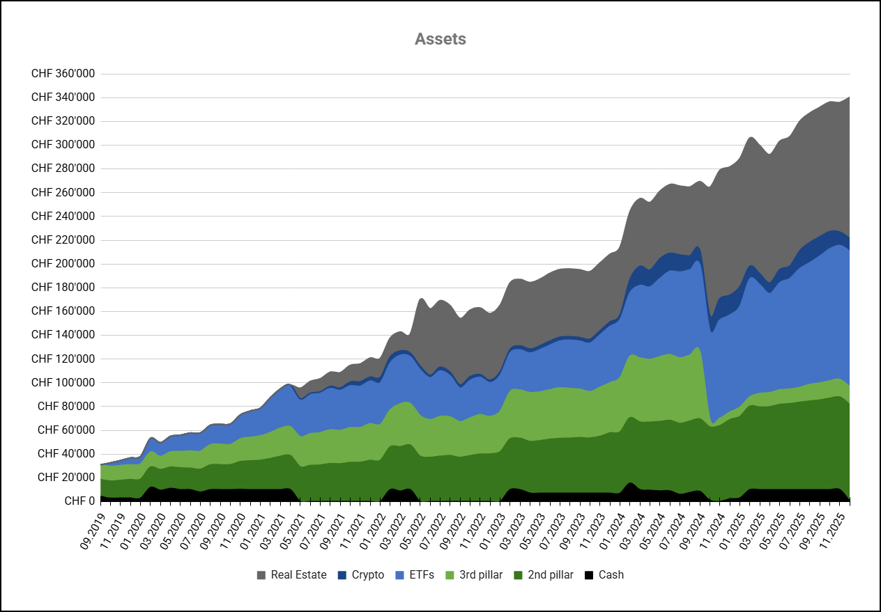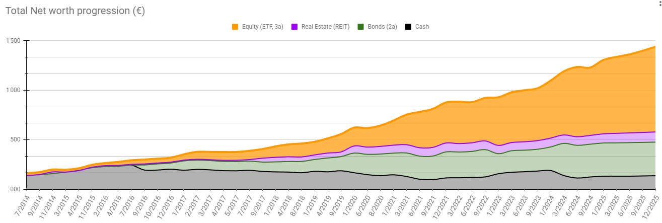 Yeah in 2025 growth was mostly driven by a good savings rate (+42.7k) and pension fund increase (+11.5k), not so much by market returns (+3.4k). Bad year for crypto and got unlucky again with my timing. Almost half of those savings/investments were from my bonus (as usual) which is paid out on February 20th every year. Which was exactly the top before the March/April crash in 2025.
