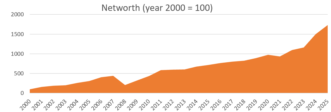 I find it remarkable that the capital has kicked in and started to work for me: Networth 17x in 25 years (salary + investments –> compounded annual growth rate of 12%)