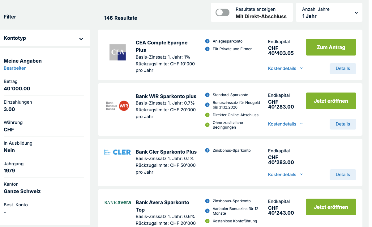 Currently (the highest-yield) savings accounts have higher interest than the highest-yield 1-year fixed deposits (Kassenobligationen/Festgeld). As the snippet of the gaijinâs snippet shows, CEA currently has the highest interest rate (1% p.a.), but thereâs a 12-month notice for withdrawals above 10k per year.