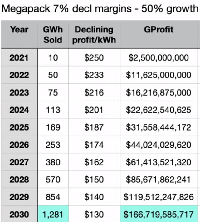 Well, you can take the data from this guy and scratch robotaxi or even megapack. You get $100 billion gross profit in 2030. Net profit is then $50 billion. And with a P/E of 40 you get a market cap of $2 trillion, so a share price of $2000.