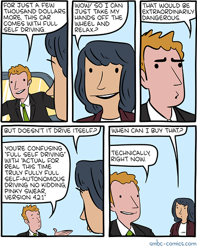Judging by what you wrote, you actually understand what they’re doing and why. And your problem is that they are disingenuous? To me it’s understandable that you have to be creative with the authorities, jumping over regulation hoops. You have to be cautious what you officially state. What is the point of labeling FSD as level 5 if we know it’s not ready yet. It’s no secret, just fire up a YouTube video and you will see drivers taking over time and time again (in the most recent video the guy from Hyperdrive said that driving over California, he has to intervene once every 30 min on average).