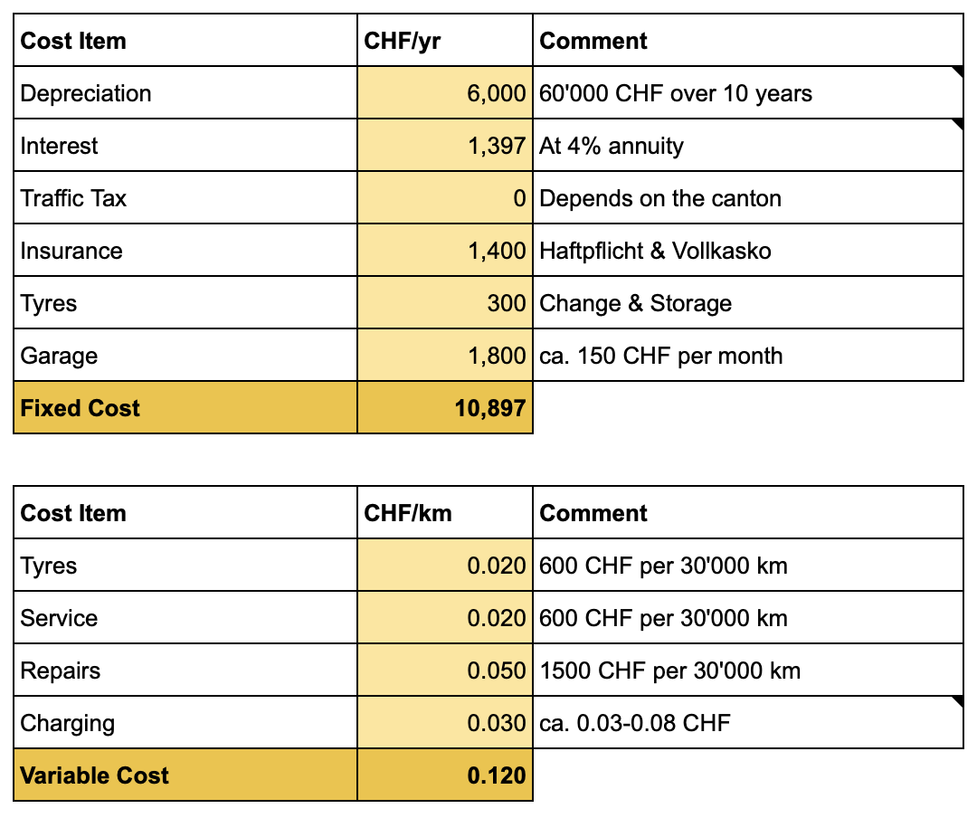 So yeah, if you gonna buy a Tesla for $60’000 using a 10-year loan at 4% interest (currently only up to 7 years is possible), you’re looking at $11’000 fixed cost per year where the car just sits in the garage. Then if you make a respectable 25’000 km in a year, add $3’000 variable cost. If after 10 years and 250’000 km your car is still worth something, let’s just consider it a bonus.