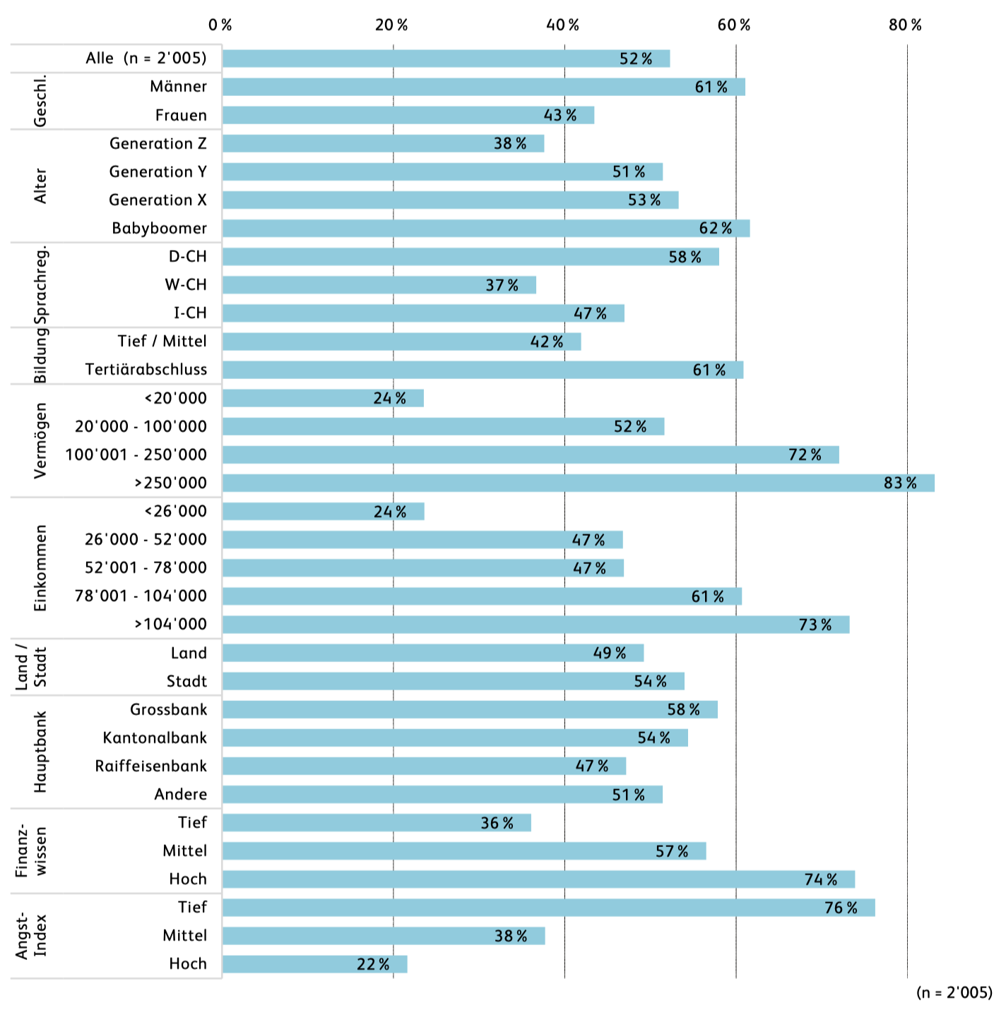 Tendenziell investieren ältere Generationen häufiger als jüngere. Von den Befragten der Generation Z investieren 38 Prozent. Bei der Generation X und Y sind es 53, respektive 51 Prozent. Am höchsten liegen die Werte bei den Babyboomern, welche zwischen 61 und 79 Jahren alt sind (Stichprobe ist beschränkt auf Alter bis 79 Jahre).
