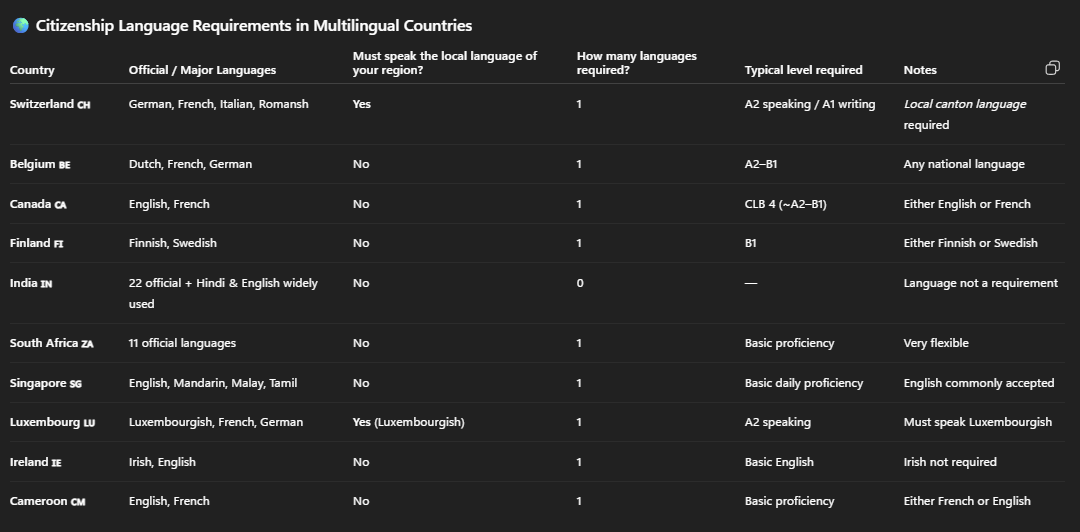in a multilingual country, what are the general rules for getting citizenship? how many languages shall I know?