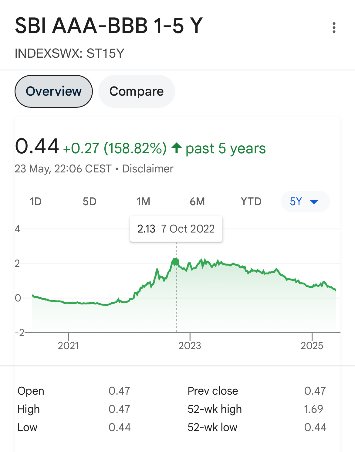 My âsimplifiedâ thinking is that CHF interest rates have dropped quite steeply since late 2024, and expectations are that even negative rates are coming soon. Such a fund with 1-5y âhigh-interestâ bonds should be increasing in value in the short-term (1-2y), but it has gone nowhere YTD. (+0.4% in 4 months).
