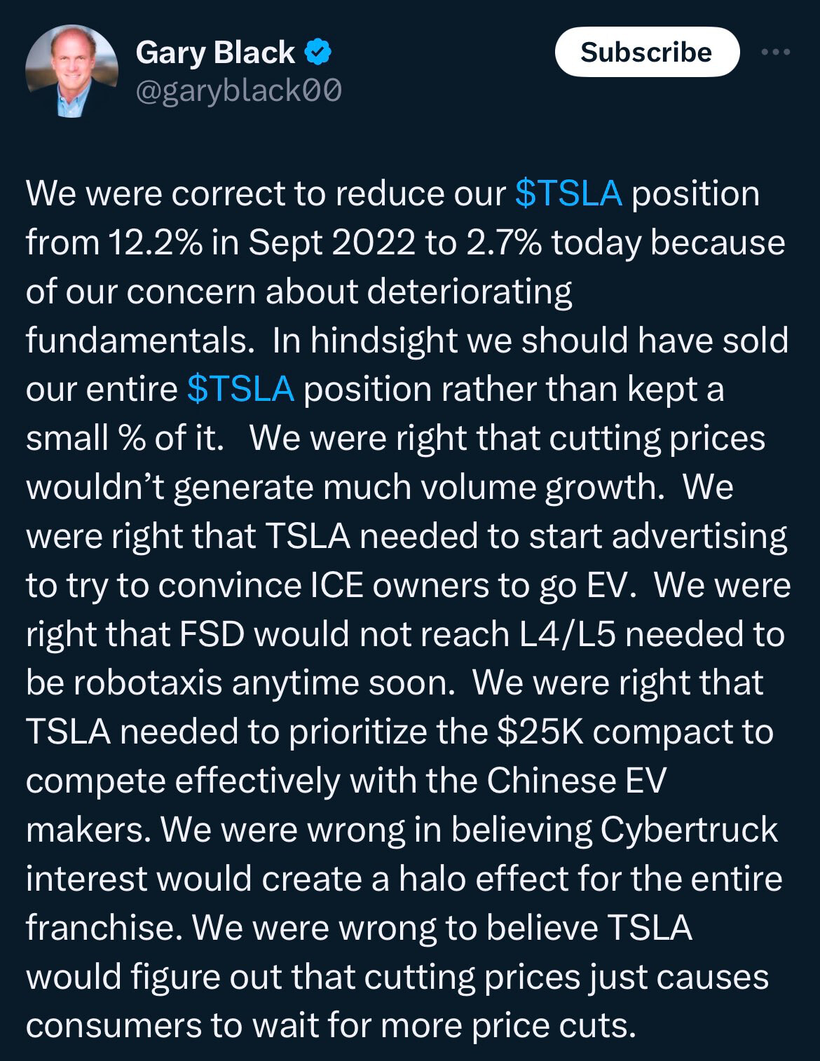 I mean, we are looking at a car manufacturer with declining margins, declining revenues (and probably declining profits, depending how they will recognized deferred revenue), with an ageing model lineup, probably no new model (if any) before 2026, and EV competition firing from all directions, especially China which used to be the bulk of the company’s profitability.