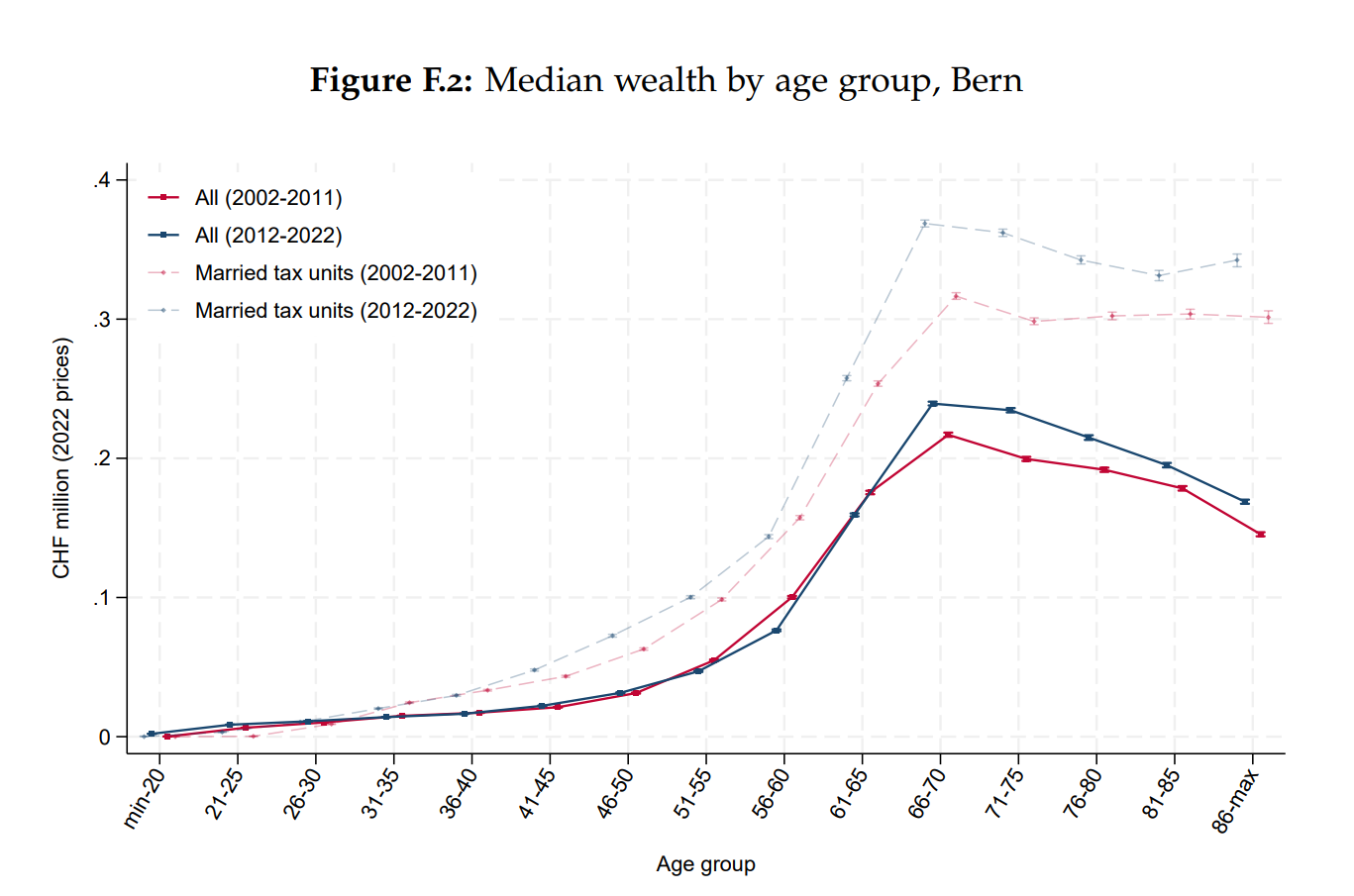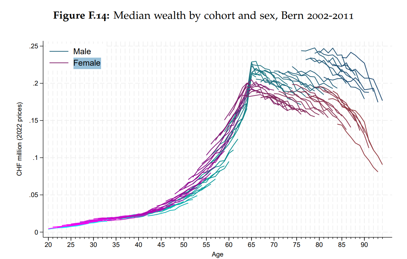 I just found this report that presents an interesting picture of wealth in Switzerland by age group, gender and inheritance. I knew that wealth (and income) increases rapidly with age, but the curve is quite steep. Half of the population aged 56–60 are millionaires.
